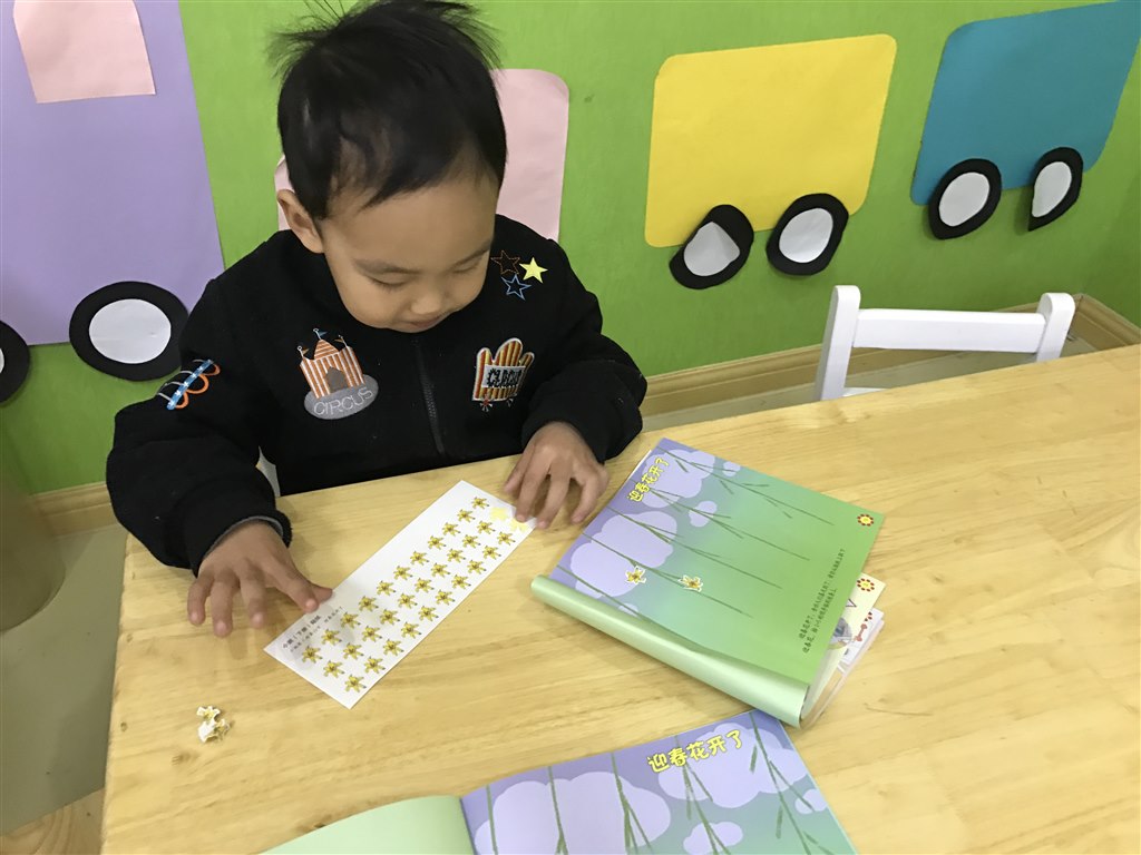 “看来。小朋友们都见过了呀!那接下来我们要给树枝贴上美丽的迎春花朵~大家要注意贴的位置哦,不能多贴也不能少贴~”