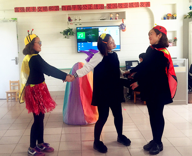 赛前,老师们从教材选择、道具设计等多方面都做了精心准备。比赛中,老师们精神饱满,热情洋溢,她们抑扬顿挫的语言和丰富的感情、生动的肢体动作,把故事情景活灵活现地展现在大家面前。蒋君、郑梦娇等八位老师编排的绘本剧《慈悲的鹿王》,鹿王舍身救母鹿的奉献精神深深地感动了在场的观众,王玉林、金花等五位老师编排的《小猪变形记》,让我们知道了原来做自己才是最开心的。郑凌云、宗旭花、陶云娣三位老师编排的《小青虫的梦》,将三位老师的舞蹈特长发挥得淋漓尽致。现场老师们充满童趣的话语和丰富的神态动作将一个个绘本故事演绎得生动形象,极具感染力。参评教师不时响起阵阵掌声。