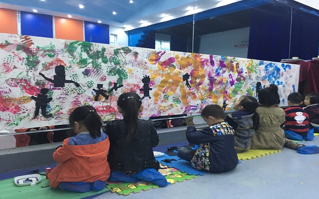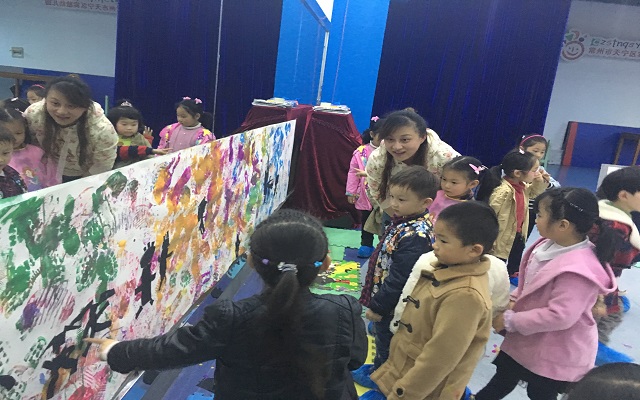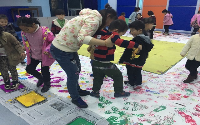 钱老师以当下季节为切入点,突破传统美术模式,以春游律动出场带入,激发了幼儿的活动兴趣。面对各种颜色,鼓励幼儿大胆去选择、去脚踩、去拓印,不一会儿五颜六色的脚印跃然于纸,令孩子们惊喜万分。从一维空间的地面到二维空间的架高转变是本次活动的亮点,让幼儿在自己春游的足迹面前,以舒服的状态,用撕贴的方式,把春游的小朋友变到画上,孩子们认真地设计、撕贴、欣赏、讲述。当三幅长卷创作完毕,我们不禁惊叹于幼儿的能力和想象力,让这短暂的美好在相机中定格。