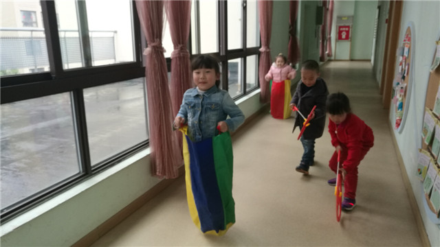 这几天春雨绵绵,影响了孩子户外体育游戏的开展,于是我园开展了恶劣(雨天)天气开展室内体育游戏的方案。为了保证幼儿的运动量,增强幼儿体质,孩子们在教师的带领下来到指定室内场地,有的班级安排在走廊上、有的安排在多功能厅,有的安排在楼梯口的空地……