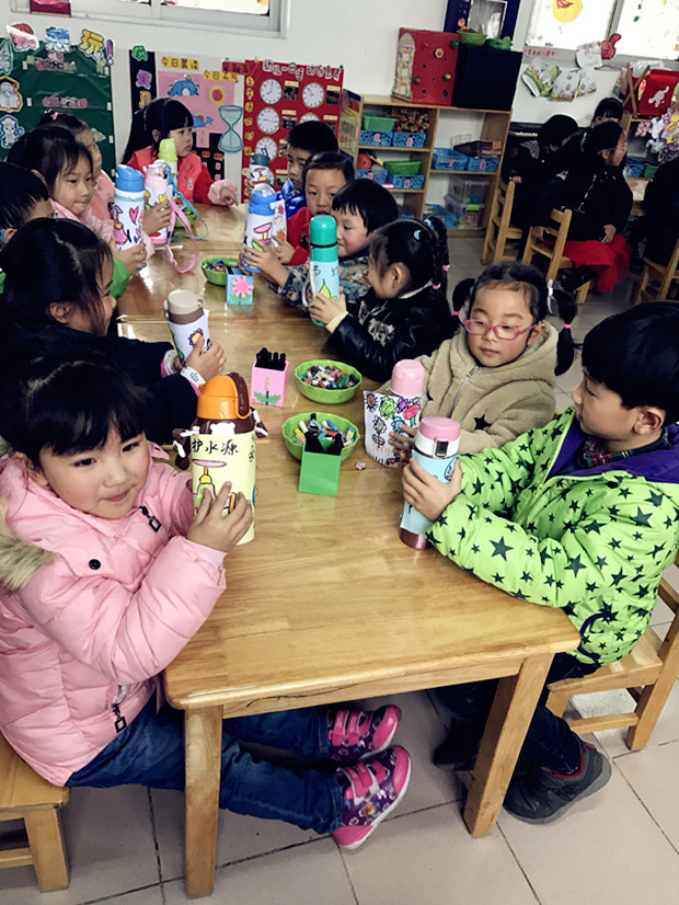 在活动开展之前,教师带领幼儿集体观看了节约用水的宣传教育片,带领孩子们一同认识了水资源的重要性。从老师自身做起,讲解了生活中节水的方法,帮助孩子们树立节约用水的好榜样。接着,在老师的带领下,孩子们有序地排队到厕所洗手,教师在洗手的过程中指导孩子随手关闭水龙头、尽量缩短用水时间,打肥皂的时候关掉水龙头等等。在实践之后,孩子们围坐一起,发挥想象,用各种各样的颜色在纸上画出了一幅幅节水宣传画。他们将这些宣传画贴在自己的水杯上,作为时刻提醒自己的标语。