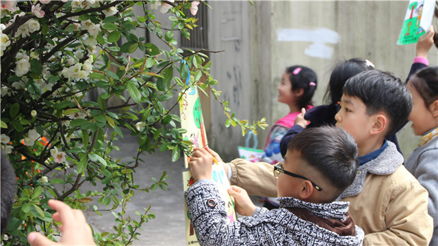 最后,孩子们拿着自己精心制作的护绿牌,纷纷找到一颗自己心爱的小树,小心翼翼地给小树悬挂护绿牌,同时还把自己的祝福语讲给小树听,真切地流露出孩子们那纯真的感情,一时间,社区里的小树仿佛都戴上了彩色的项链,夺目极了。