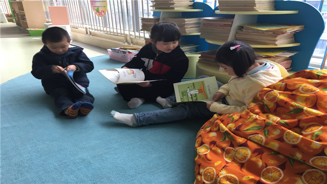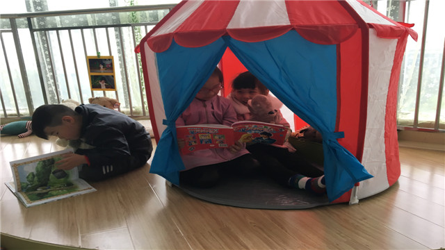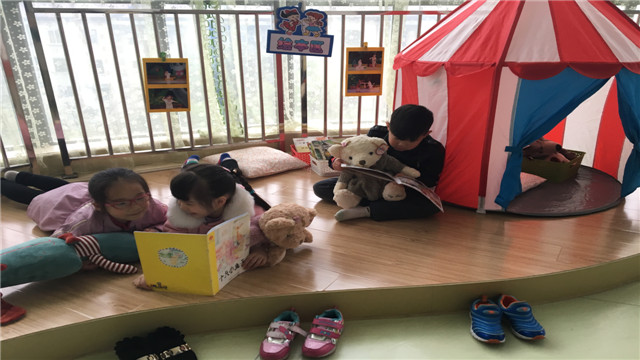 红梅幼儿园为了促进全园幼儿阅读与表达能力的“发展”,养成良好的阅读习惯。引进大量的优秀幼儿绘本,在全园范围内展开绘本阅读活动。在四楼开阔的阅读空间,孩子们在自己喜欢的卡通动物的陪伴下自由阅读,在温馨的靠垫、柔软的地毯、奇妙的小帐篷、变换的小凳子都给孩子们的阅读带来了无穷乐趣。孩子们共享书籍,享受阅读的快乐。