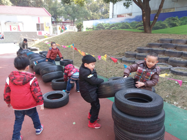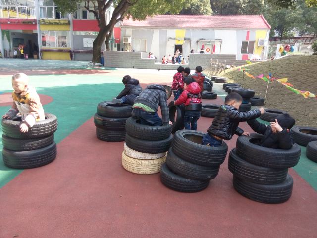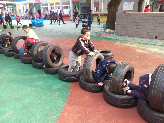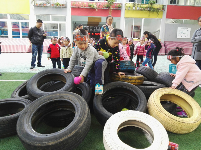 通过这个游戏,锻炼了孩子们的身体协调能力、平衡能力和创新能力。 孩子们正是有了自由的想象,自由的探索,才能真正成为活动的主人!瞧,孩子们有的让轮胎滚动起来,有的把轮胎一个一个叠起来在躲进里面玩打地鼠的游戏,有的当成平衡木在上面行走,有的用轮胎“练习”游泳,有的则是把轮胎竖起来从中间爬过去,还有的把轮胎堆成小山,大家一起攀爬“轮胎山”……,和轮胎来了一次最亲密的接触,孩子们把轮胎玩到了极致。