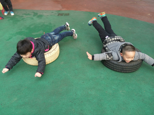 瞧,孩子们有的让轮胎滚动起来,有的把轮胎一个一个叠起来在躲进里面玩打地鼠的游戏,有的当成平衡木在上面行走,有的用轮胎“练习”游泳,有的则是把轮胎竖起来从中间爬过去,还有的把轮胎堆成小山,大家一起攀爬“轮胎山”……,和轮胎来了一次最亲密的接触,孩子们把轮胎玩到了极致。