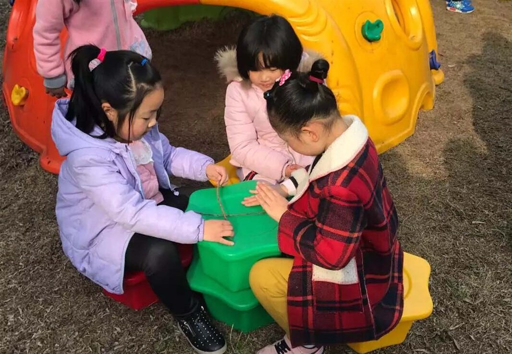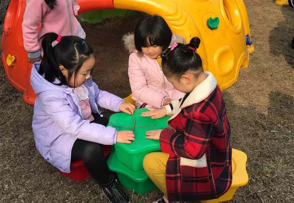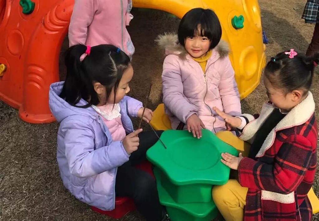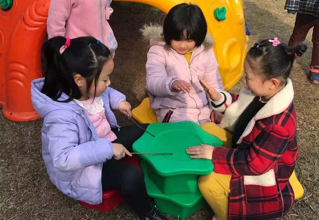 在南操场的草坪上投放了几个梅花桩,供孩子们踩踏玩耍,在今天清晨的晨间活动中,大二班的老师惊喜的发现,幼儿用梅花桩玩起了新花样,她们把梅花桩垒高,分别坐在梅花桩的侧面,用手拍打桩面,发出了好听的声响,还结合了音乐活动中才学过的四二拍节奏,敲得有模有样,最后,她们还玩起了三人合奏,找来了树枝,来丰富这悦耳的音律,用来踩踏的梅花桩俨然成了一面敲击有声的大鼓,孩子们玩得开心极了。