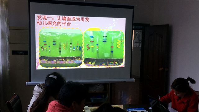 那么如何在区角活动中创设能引导幼儿自主学习的环境呢?如何有效地利用活动室的墙面,将主题墙饰与区角活动有机结合,在第二个环节里,王老师从“三个发现”展开介绍:让墙面成为引发幼儿探究的平台、让墙面成为幼儿动手操作的平台、让墙面成为幼儿体验成功的平台。针对本园区角环境创设的现状,王老师又结合自己班级里的墙面布置让大家看到了操作性强、一物多玩的创新玩法,如:毛球球的多种利用,既可以放在建构区让孩子们进行趣味塞塞乐,又可以放在生活区玩毛球球匹配的游戏;材料简单、操作性强的穿穿乐,按照颜色、大小找一找、穿一穿培养了孩子们的动手能力和观察能力。