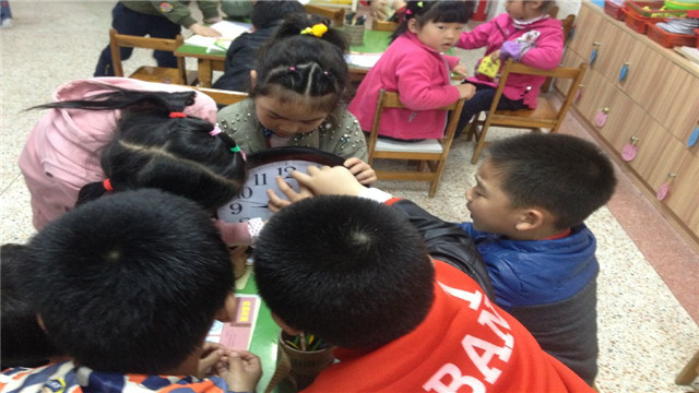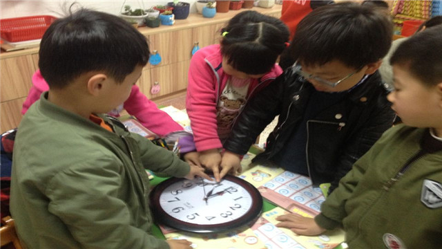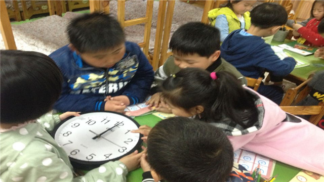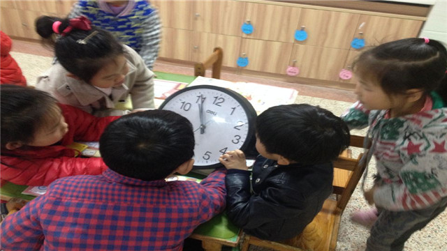 活动开始时,引用了游戏图片“起床了,上学了”,说一说自己的发现,和与其图片相同的生活内容。接着认识时钟,采用分组的方法,讨论钟表的结构,并且大家找一找钟面上整点与半点的时针与分针的位置是否正确,相互游戏,相互纠错,在交流、探索的过程中认识整点与半点。接下来的,示范活动的难点,用简单的方法让幼儿记忆分针与时针名称,“哥哥叫长针也就是分针,弟弟叫短针也就是时针”。掌握时针与分针之间的运转关系,走一圈时分针,时针各有什么变化,通过实践操作,幼儿对于整点半点了解的还是很清楚。