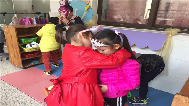 活动中,我们给幼儿提供了充足的游戏时间,也在有限的空间里尽可能布置环境,丰富材料。大班下学期的幼儿以物代物的能力有所提高,和同伴协商、分工合作较好,在游戏中轻声交往的习惯也有较大进步。你瞧,孩子们还学会了与同伴协商分配角色,好朋友在互相帮助打扮自己呢!
