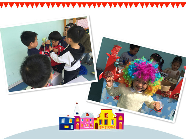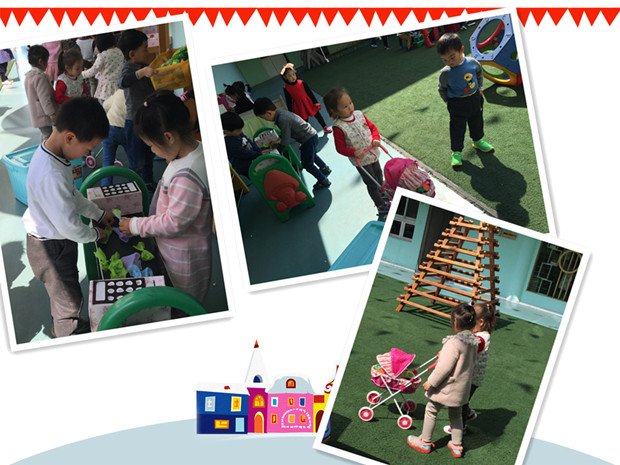 说干就干,老师们把创造性游戏室的东西都搬到了户外走廊上,由于孩子们都有一定的操作经验,所以不用老师引导,孩子们便自主地玩儿了起来。你买我买,像模像样。有的在卖早点,有的在理发,有的推着婴儿车逛超市……而此时,老师们只需要做个安静的观察者,在一旁记录。
