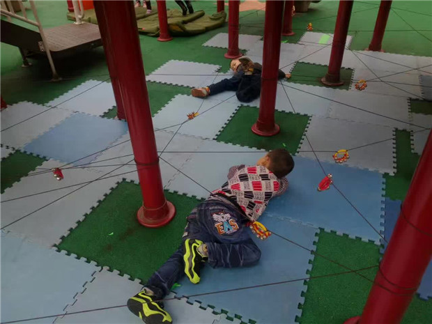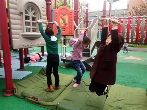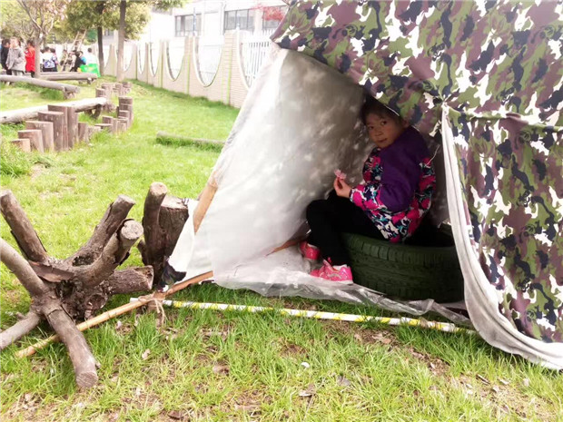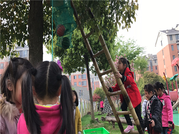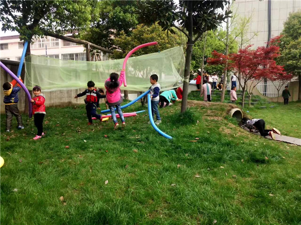 调整后的环境,孩子们玩的不亦乐乎。在生态园旁的空白塑胶场地,用白色油漆绘画了足球场地图,有了场地图,足球小队员们知道哪些地方是自己的领域,用红蓝两种颜色的头饰区分两队队员,运动员们在赛场上奋力奔跑,用记分牌记录成绩。在我园东面有一大块生态园草地,老师们根据场地的现有资源,增添游戏材料,创设出新的游戏内容。在两棵最宽的树中间放一块纱布,就成了孩子们投掷的乐园;选择用最粗壮和枝丫最牢固的树,架一个梯子,让孩子们永攀高峰解救球宝宝,孩子们玩得开心的同时注意器材的安全,用铁丝把梯子和树牢牢绑在一起,梯子下面用布包住,防滑;在角落里用竹竿和布搭建了休息区,孩子们玩累了,可以坐在这里喝点水,聊聊天。滑滑梯是孩子们最喜欢去玩的地方,考虑到大班孩子的年龄特点,利用滑滑梯下面空的场地,老师奇思妙想布置了过铁网的情景,利用滑滑梯的杠子加上圈和木棍,让孩子们感受旋转带来的快乐。