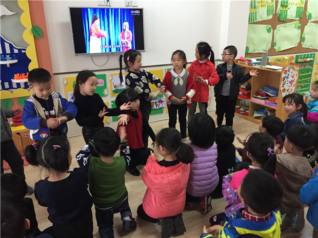 大班的孩子首先在老师们的带领下学起了戏曲唱腔,在老师的指点下,他们现学现演,从刚开始不熟练自己的角色,然后通过互相交流讨论理解故事内容,发现各个角色的性格特点,短短两遍的排练之后,孩子们就能将台词、动作记得“滚瓜烂熟”,并能在同伴面前大胆的表现自己。