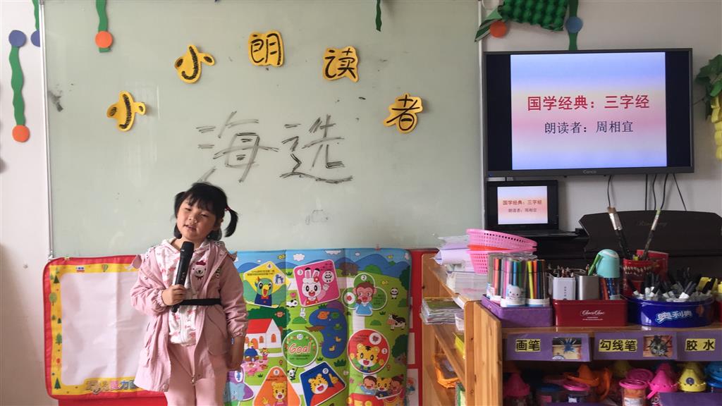 在我们活动的现场,孩子们用稚嫩的童声、天真的表情,朗诵着他们喜爱和熟悉的儿歌、古诗、诗歌、国学经典、故事等。朗读的内容不同,小朋友的表现力也各不相同。古诗词《念奴娇·赤壁怀古》及现代诗词《沁园春·雪》的不同演绎,让孩子们在古今对比中领略了诗词魅力;国学经典《三字经》《弟子规》让我们一起穿越千年,聆听古圣先贤的谆谆教导;故事《三只小猪》《三只小猫和一只红气球》的演绎童真可爱,儿歌《幼儿园像我家》抒发了孩子对幼儿园的喜爱。
