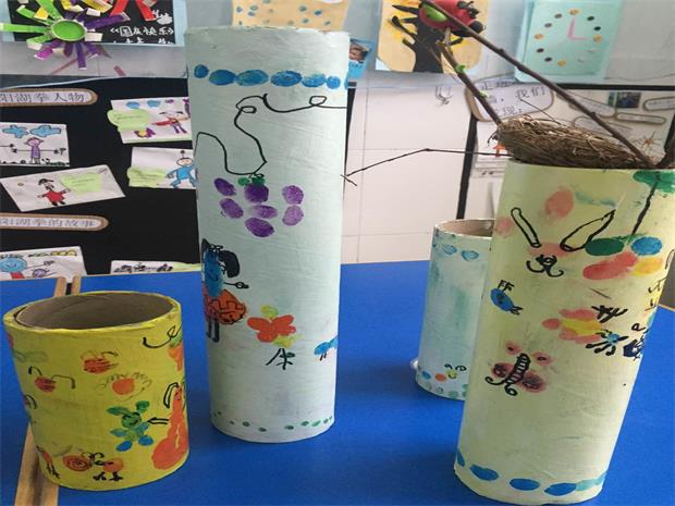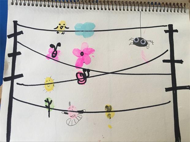 一开始,孩子们只是简单的利用指纹“变”出毛毛虫、太阳、花朵、小人、葡萄等比较单一的造型。慢慢地,在一次一次的尝试中,他们又给自己的创造添加了简单的背景,变成了一幅创意指纹画。在不断地打磨与实践中,孩子们开始自由组合,编出了属于自己的手指游戏创意画册。