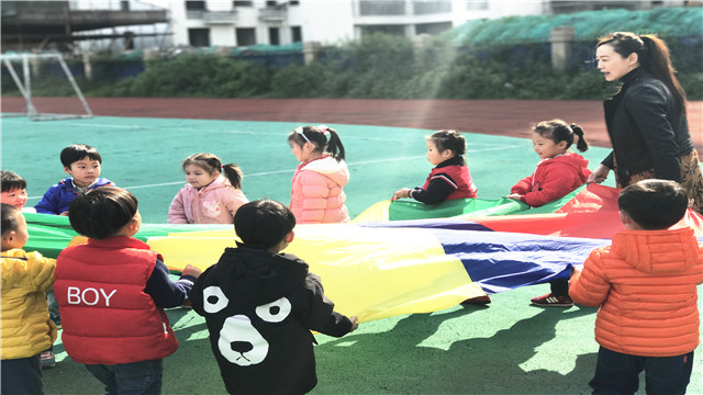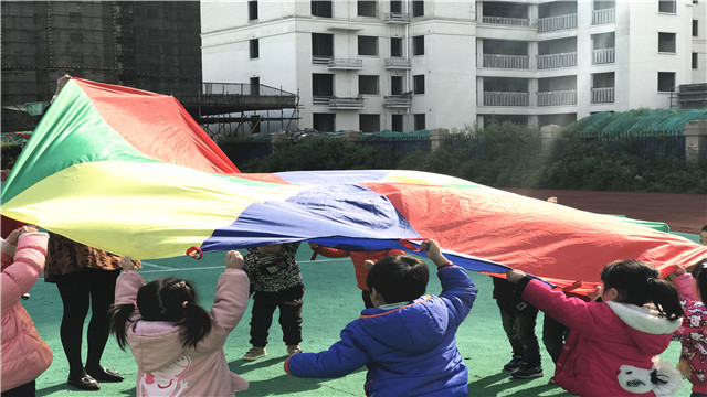 今天下午,老师带领我们小朋友去操场上玩彩虹伞的游戏。游戏规则是要小伙伴们一起拉起彩虹伞,一边转圈圈一边念儿歌,一同举高一同放下,网住没来得及从彩虹伞里逃跑的小朋友。每次放下彩虹伞总有几个小朋友来不及逃出来被捉住,引得小朋友们一起开心的大笑,笑的眼睛眯成了月牙,笑得嘴巴弯成了小船。