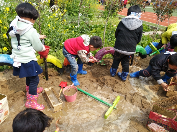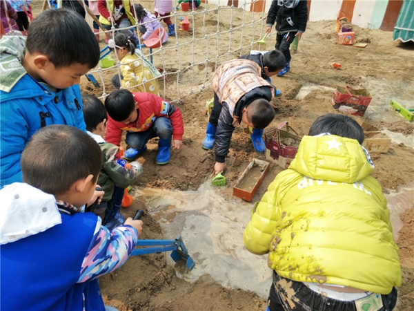这里是孩子的地盘,他们喜欢在沙地里蹦蹦跳跳,看着自己留下的脚印,傻傻的笑着“快看,我的脚好大!”他们喜欢抓起一把沙子望天上扔,嘴里喊着“下雨啦!下雨啦!”他们喜欢挖一条长长的沟,打开水龙头对着里面放满水,“这是大海,老师,大吗?”“我们再把它挖深一点,水要满出来了。”一个小朋友走进放满水的沙坑里,用力的踩着,嘴里一边说着“快看!水溅出来了,要下雨喽!”