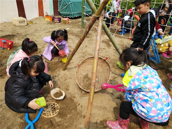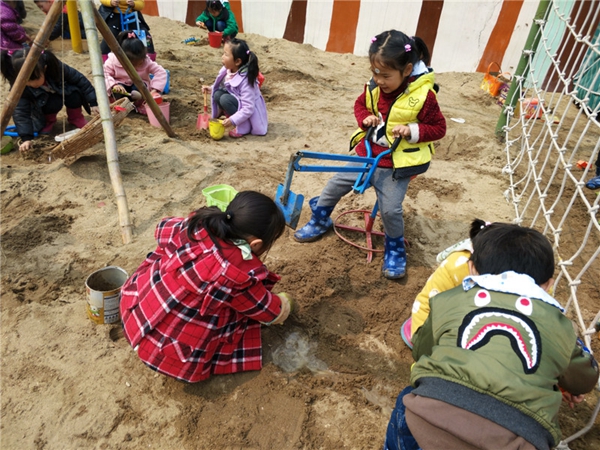 每天早上的户外活动是孩子最开心的时光,而我们班来说,沙坑是他们最喜欢的游戏场所。沙子具有流动性,踩上去会下陷,给幼儿提供特殊的感知与感觉。幼儿抓起一把沙子时,沙粒从指缝间“溜走”,孩子会好奇的盯着看。