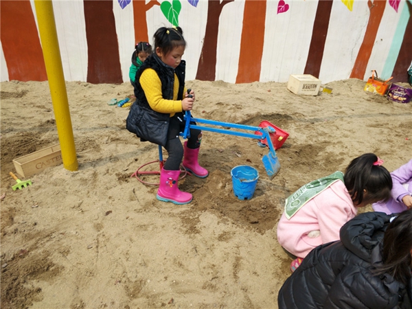 另一个小朋友拿着一个简易的挖掘机过来,在沙坑里挖掘机回到,立不住,小朋友想了一个办法,先将挖掘机埋在沙里,再开始挖坑。这要给孩子空间和材料,孩子们总会乐此不疲,玩出各种花样。