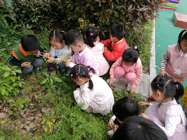 早上,孩子们在老师的带领下感受到春天的气息:和煦的阳光、清新的空气、盛开的百花……好一派生机勃勃的景象!