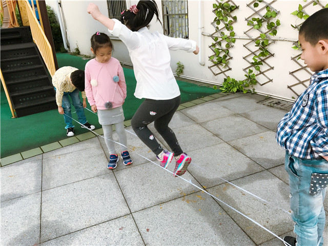 跳皮筋不仅取材方便,只需要一根细长的皮筋和一块小小的场地,而且在两脚交替跑跳中能全面锻炼幼儿的身体。这次活动,不仅让孩子体验到了成功的快乐,同时,也促进了幼儿合作交往能力的发展。