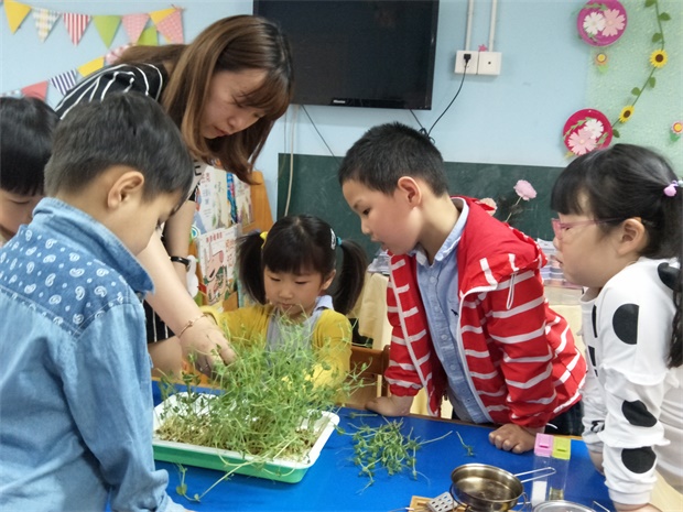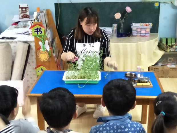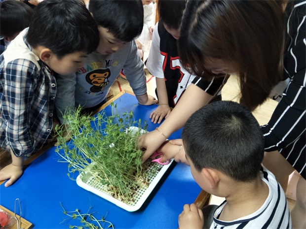 春天,我们班的植物角购买了豆苗和小麦的种子进行了有趣的“纸上种菜”。将这些种子种下后,小朋友每天会给它们浇水、细心的照顾它们,看着小苗一天天长大、开花、结果,小朋友们都很激动,“老师,你看,小麦长出来啦!”“老师,豆苗有这么长啦!”