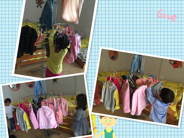 天热了,孩子们常常需要脱下外套,那外套放在哪里就成了大问题,以前,孩子们脱下来的衣服都是堆在一起的,拿的时候很混乱,于是,我们就在班级里添置了大衣架,孩子们每天自己把脱下来的外套给挂上去,渐渐地在挂衣服中,孩子们还练习到了,拉拉链、扣扣子、有序整理等生活中必要的自理能力。