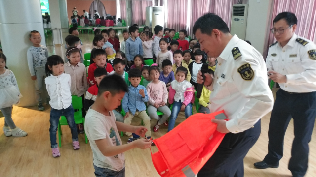 讲座完毕,海事局的同志在台上与全园师生进行互动,手把手指导老师和幼儿在遇到紧急情况下穿戴救生衣自救的方法。经过亲自动手实践,老师和幼儿们都掌握了正确的穿戴救生衣的方法。他们还给全体幼儿发放了水上安全知识宣传册,让幼儿回家和家长一起学习,营造家长、学校共同关注水上交通安全的良好氛围。