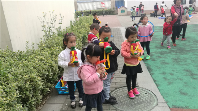 请不要惊讶于此处为何有如此多形态各异的水杯,这是户外活动时间小朋友们的充电站!累了,渴了,他们就会来这里找到自己的水杯,喝点水。每到户外活动时间,孩子们便自己背着水杯跟着老师到户外游戏区玩耍,这似乎已经是我园一道独特的风景。