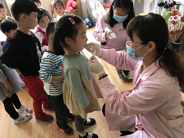 近日,常州新世纪幼儿园进行了全园幼儿龋齿普查、涂氟防龋工作,医生耐心地为每位幼儿检查,帮助该园做好牙防工作。