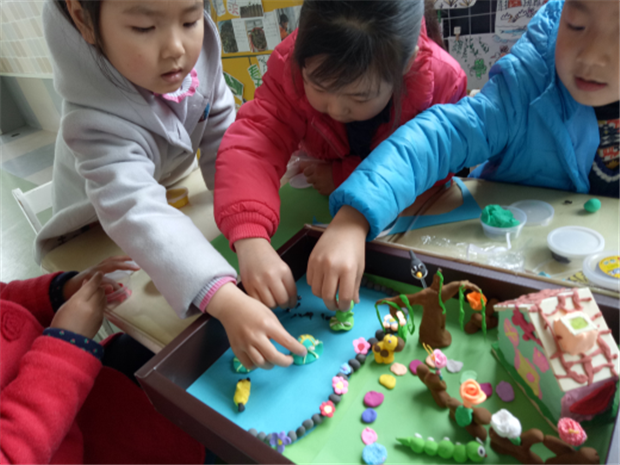 教育家苏霍姆林斯基曾认为:儿童的才智反应在他们的手指尖上,只有让孩子在操作中动手、动脑,多种感官参与活动,才能使他们的智慧和能力得到最大限度的发展。为了充分培养幼儿的创造思维能力、想象力和动手操作能力,我们把班级的特色--创意泥制作,创新设想,为幼儿提供一些可支撑性的低结构材料,让幼儿自主选择,结合主题,做孩子们自己喜欢的场景。