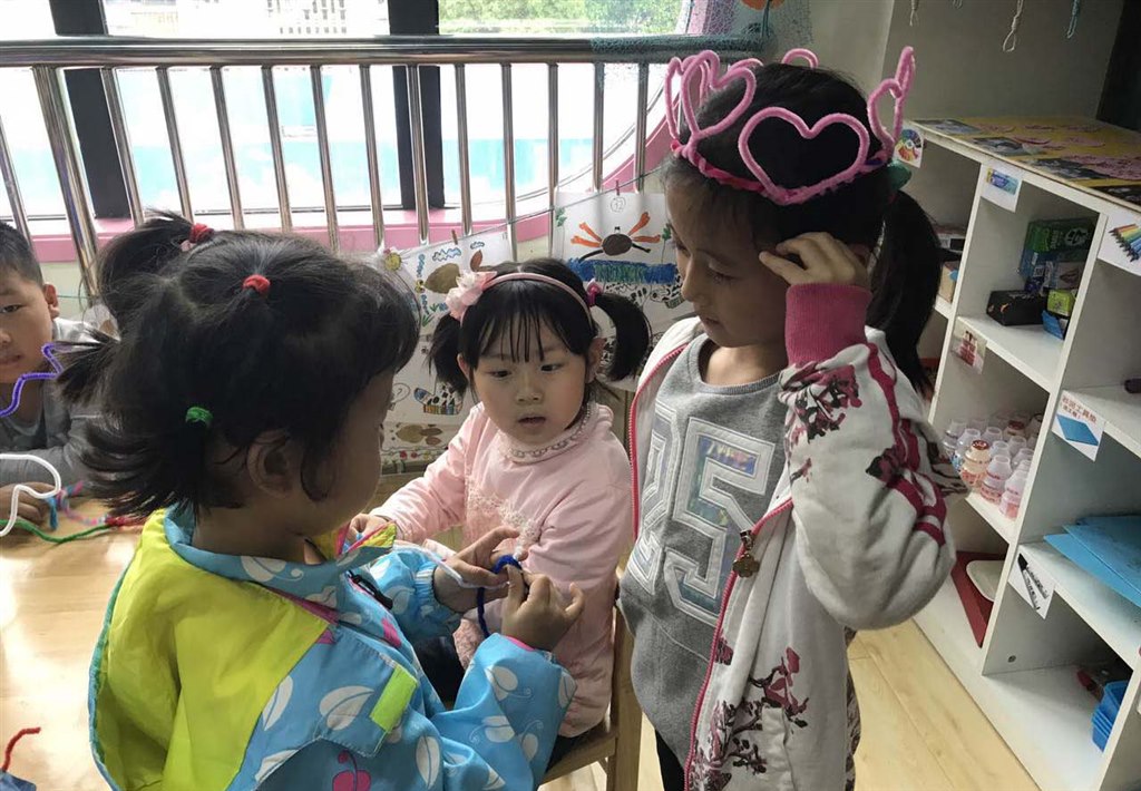 活动中,当教师拿出用一根根色彩鲜艳,手感柔和的毛根编制的眼镜、发卡等作品时,立刻吸引了孩子们的注意力,激发了他们的创作欲望。随后,在老师的指导下孩子们发挥想象力和创造力,用一根根五彩的毛根编制了戒指、皇冠、花朵、毛毛虫、蝴蝶等惟妙惟肖,栩栩如生的作品。孩子们对自己的作品爱不释手,一个个争相带上自己做的眼镜、皇冠等进行游戏,孩子们在快乐的游戏中,发现了生活中的美也创造了美。