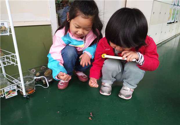 一场雷雨过后,丽华三幼中一班教室门口的小花园里爬来了3只蜗牛,蜗牛们一前一后地努力爬行着,引来了两个小女孩地观察和议论,悦悦说:“它们这是要去哪?”恩恩说:“它们肯定是出来玩的,现在准备回家了。”悦悦说:“我觉得它们是在比赛……”这时两人开始讨论赛跑的话题,悦悦说:“你猜哪只蜗牛最先爬到花园?”恩恩:“我觉得中间那只爬的最快了”悦悦:“你看,那只爬在最前面的蜗牛真神气,一直高高抬着头……”