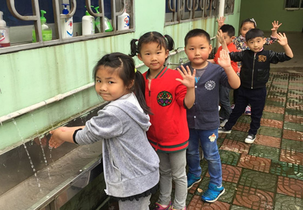 我园根据手足口病的预防手册,分别从湿、搓、冲、捧、擦等六步骤教孩子正确的洗手方法,即在水龙头下把手淋湿,擦上肥皂或洗手液,手心、手背、指缝相对搓揉20秒以上,用清水冲洗,再用手捧水将水龙头冲洗干净,然后拧上水龙头,最后,用干净的毛巾或纸巾擦干。老师先一步步演示,小朋友们有模有样的跟着学,并安排小朋友走进洗手池,进行实际操作。