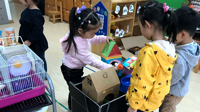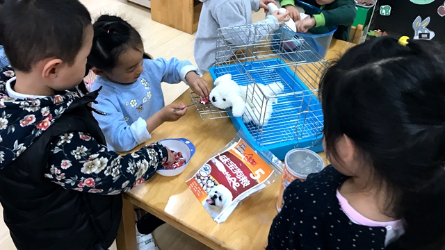 比如在小班开设的创造性游戏中,小二班有小朋友提出要开一家店,老师问他们是什么店,他们说:“这家店是专门养狗、养猫养鸟的”,“那这家店里专门养这些小动物有什么用呢?”“我们养这些小动物可以让别人来买,买回家养着可有趣了”。于是小朋友都决定开一个 “宠物店”。瞧,小兔饿了,给它喂点吃的吧,小猫渴了,给它喝点水吧,小老鼠累了,让它躺着睡觉吧,小狗脏了,帮它洗洗干净吧!小朋友个个都忙的不亦乐乎。