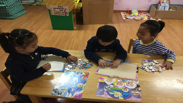 有的孩子在专心致志地拼着拼图,一边思考着一边把拼图放在合适的地方。有的孩子玩起了新式拼图,他一边拼一边细心地讲解,旁边的女孩子都被吸引了过来。还有的孩子玩起了迷宫游戏,智力拼板、穿泡泡项链......大家快乐而投入地玩着益智玩具,享受着游戏的快乐……