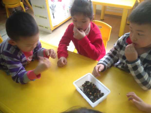 大自然是孩子们学习最好教材,幼儿园的种植环境也是送给他们最好的礼物。在这里,孩子们观察身边最近的最熟悉的物,通过亲眼看、亲耳听、亲身做去揭开大自然的秘密。我园种植区墙边有一棵桑树,每次户外活动时候,孩子们便成天仰头观望,盼望着绿绿的桑葚赶快成熟。随着时间的推移,桑葚一天天变红变黑,为了追随幼儿的兴趣,2017年5月3日,中一班的林老师组织孩子开展了采摘桑葚活动,孩子们在采摘桑葚、捡桑葚、洗桑葚、品桑葚中认识了桑葚,体验活动的有趣。
