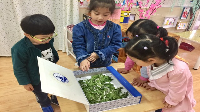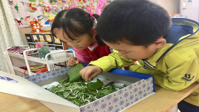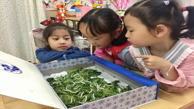 环境生成课程,课程来源于生活。伴随着蚕宝宝的成长,孩子们收获的不仅仅是蚕宝宝形态变化的知识,更是通过亲身实践体验到了怎样去关爱身边的人和物的情感,感受着生命的意义所在。
