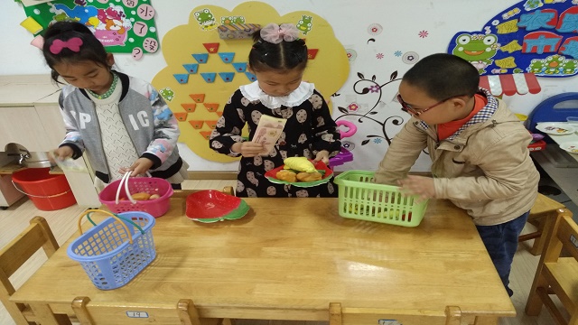 “欢迎下次光临!”顾客高高兴兴地拿着苹果走了。这是孩子在游戏中一次简单的买卖过程。