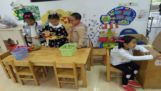 农贸市场里,除了传统的购物方式,孩子们的游戏也与时俱进。有的孩子专门负责网上订购事宜,付款方式可以扫描二维码,网上支付;有的专门负责分配包装,把蔬菜和水果分好类;还有专门的送货员负责配送给个人或餐厅。