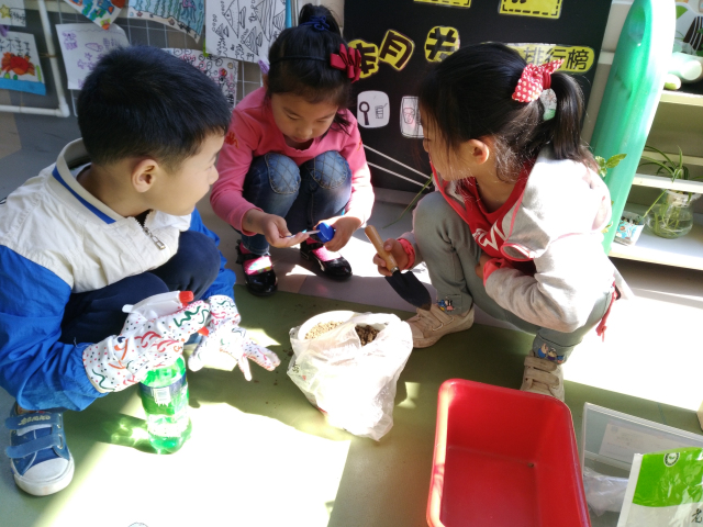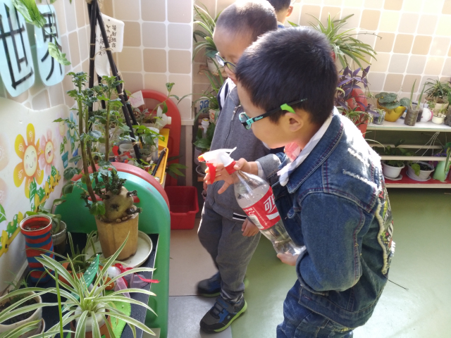 丽华三幼大一班的孩子们在老师的带领和指导下,也开始学习自己照顾和管理自然角。一些责任心强、细心的小朋友常常在餐后、点心后等自由活动时间主动来关注自然角:摸摸泥土的干湿情况,修剪掉一些干枯的叶子,适当浇点水……还真像那么回事呢!孩子们照料以后,还会留下自己照看的影子。瞧,今天我给花儿浇水了,在浇水的地方插上自己的照片;今天我来松土了,我也在“铲子“的地方插上我的照片;这样老师和孩子们一目了然,知道今天有人浇水了就可以提醒其他孩子不要再去浇了。