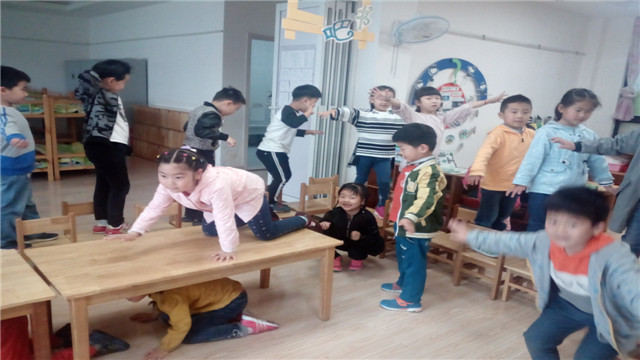 虽然屋外下着雨,但雨天也挡不住孩子们爱运动的脚步。广幼的老师带领孩子们在室内创设了丰富多彩的室内晨间活动。如:利用桌椅在教室里搭建了“小桥”、“ 高山”、“ 山洞”。利用饮料瓶、软管等在教室门厅搭建了“池塘”、“小路”、“小花”。孩子们在这些丰富多彩的游戏中,尽情地与同伴快乐玩耍。在玩耍中锻炼孩子们的各种体能,增强他们的体质,练习各种技能。