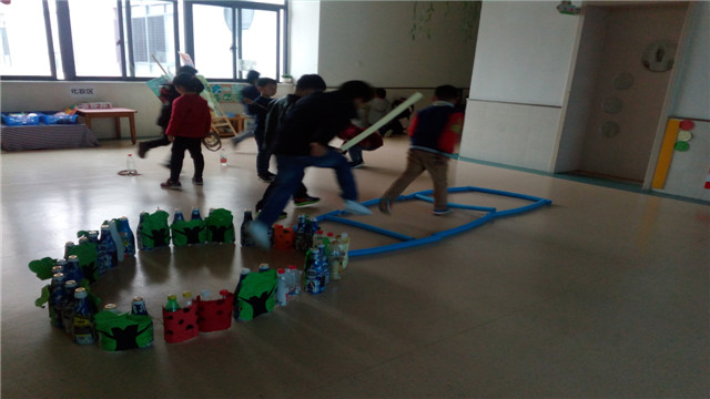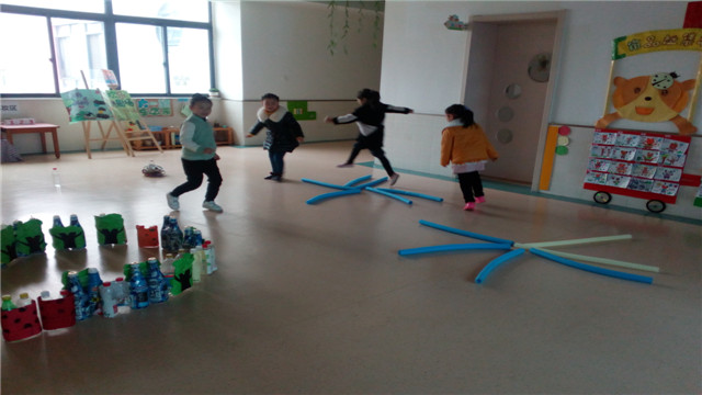 瞧!孩子们在“小桥”上平稳而快速地行走,上肢动作不断地变化着造型;孩子们快速地爬上“高山”,穿过“山洞”;孩子们动作敏捷地跳入“池塘”学着蛙泳;在“花瓣”间单脚跳,双脚跳不断的交替着……孩子们一个个玩得不亦乐乎!