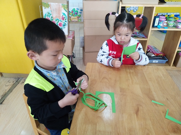 瞧,孩子们拿起一样大小的纸用剪刀沿着纸的边缘剪开来了,大家屏住呼吸,睁大双眼,生怕把纸剪断;可还是有个别小朋友有点粗心将纸剪断了,不过他们的心情丝毫不受影响,重新拿起剪刀继续往下剪。不一会儿,孩子们都剪好了,拿到地上做的标记面前来比比谁的纸儿长:“我的纸有两个星呢!”“这算什么,还是没有我的三颗星的纸儿长!”“我的纸儿都超过三颗星了,下次我争取拿个四颗星!”孩子们你一言我一语的争论着。