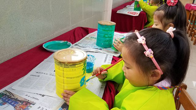 为了让全体小朋友积极参与到爱鸟护鸟行列中,我们与孩子一起讨论、商量怎么样来爱护鸟类,不让它们受到伤害?有的说:“我们不能随便拿枪打小鸟”,有的说:“看到有人伤害鸟类要及时报告”,有的说:“我们可以给鸟类做个窝,不让它们被雨淋到……”于是,我们决定给小鸟设计一个可爱的家,让小鸟来歇歇脚,或者,鸟妈妈可以来鸟窝生鸟宝宝。可是得用什么材料来做小鸟的窝呢?蒋鸿燊小朋友说:“我小时候吃的奶粉罐子可以做鸟窝,是铁的,雨淋到也没事”。于是,孩子们纷纷从家里带来了奶粉罐,还给它进行装饰了一翻,涂上漂亮的底色,再画上大树、小草、花儿。