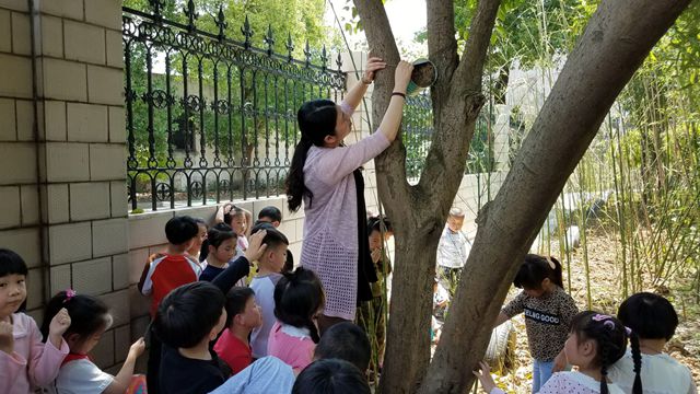 小鸟漂亮的家做好了,小朋友们走出教室,来到幼儿园的小山坡,进行鸟窝投放活动。孩子们雀跃不已,先请保安爷爷给鸟窝打孔、穿铅丝,这样可以更稳固的放在树上,小鸟也更安全。有的小朋友还在户外找寻一些枯树枝、树叶放到鸟窝里,这样鸟儿们来住的时候可以睡的更舒服。