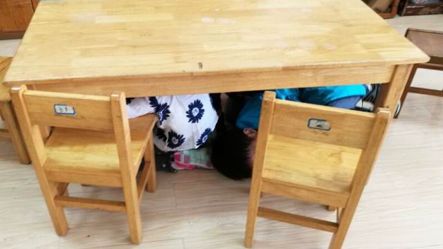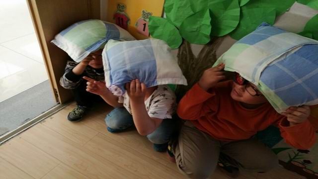 在孩子们了解了防震安全疏散知识后,幼儿园组织孩子们开展了“地震逃生安全自救”演习活动,孩子们把了解到的知识都用在了演习活动中。有的孩子躲在了墙角等壁垒下,用枕头、软垫保护头部,有的则躲到了厕所等狭小的空间,还有的躲到了桌子底下……通过演习活动,进一步帮助幼儿掌握了“地震逃生”的知识和技能,提高了孩子紧急情况下的应变能力。