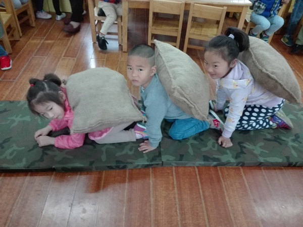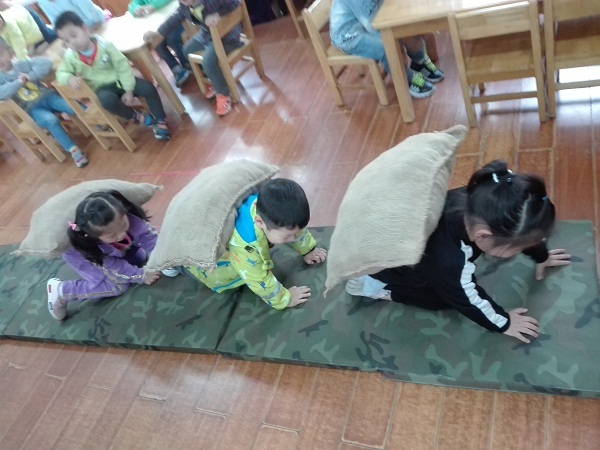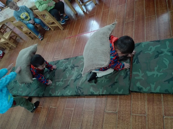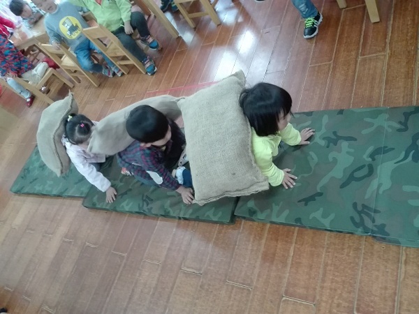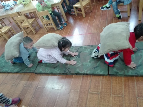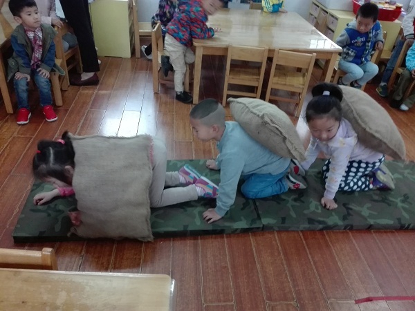 看,蚂蚁宝宝渐渐长大了,必须要学会很多运粮食的本领,今天学习运粮食的一个本领是抬头爬。小手小手往前爬,小腿小腿往前爬,小头小头抬起来,粮食粮食不掉下来。瞧,蚂蚁宝宝们真能干!在垫子铺成的道路上,他们身体弯曲,手膝着地,背扛粮食,慢慢地一步一步地往前爬。虽然粮食时常会从蚂蚁背上摔下来,但是他们并没有就此放弃,而是一次次的重新扛起来,把粮食搬运回了家。从中,幼儿体会到了劳动的艰辛,纷纷说:“老师,搬运粮食真是不容易啊!”“我以后要珍惜粮食,不能再挑食了。”“我要把饭都吃光光,搬运粮食很辛苦的。”……