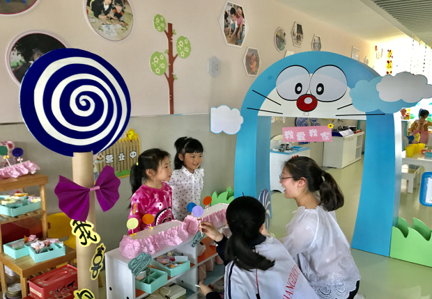 这群大姐姐们观摩了班级区域游戏、公共区域游戏、户外游戏等,和小朋友们来了个零距离接触。我们小班的小朋友们看到来了这么多的大姐姐,非常激动,热情地打着招呼“姐姐好,你会做饼干吗?”、“姐姐,你要买糖吗?”……让这些大姐姐忍不住停下脚步,和小朋友一起玩起了互动游戏。