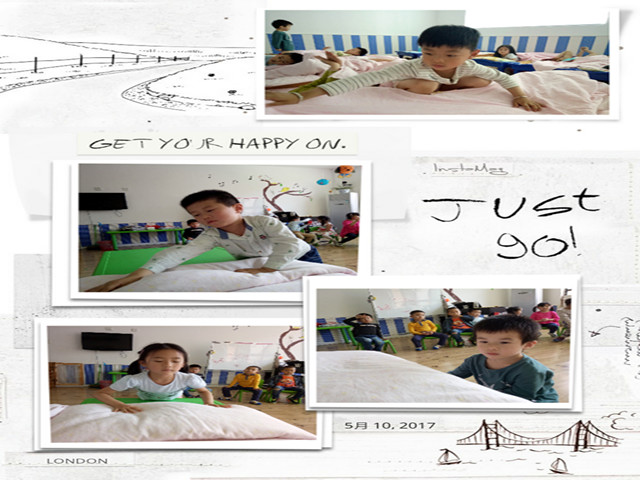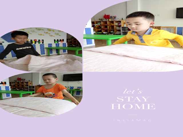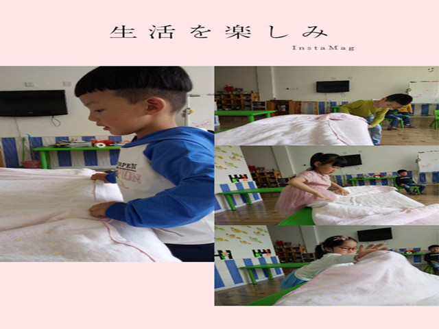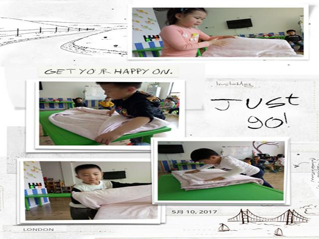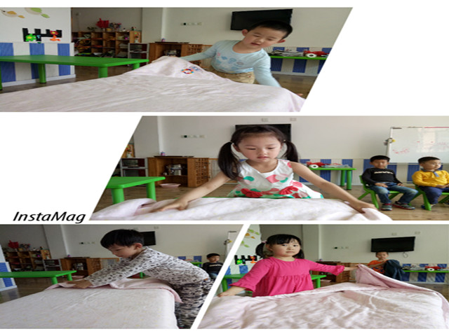 于是,孩子们开始偷偷的准备,自己穿鞋,自己吃饭,自己整理玩具,甚至大家还把自己的被子搬来了教室练习叠被子,嘴里念念有词的说着儿歌,“小被子,要叠好,四四方方见棱角。小被子,铺平了,头对头来角对角。宽折三,长折四,心要细来手要巧。小小宝宝叠小被,小被叠得齐又好”。问他们为什么要叠被子,孩子们小声地说道:“因为平时睡懒觉,被子一直是妈妈叠的。我要妈妈知道我也可以,这样妈妈睡觉起晚了,我就可以帮她叠被子了”
