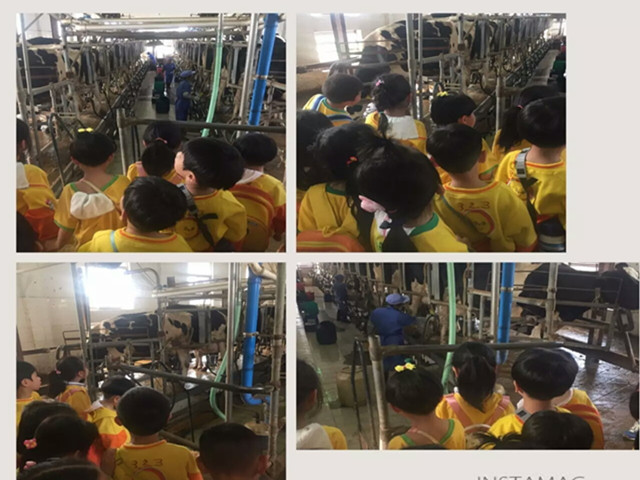 接着,在工作人员的带领下,小朋友们来到了挤奶间,看到里面有密闭挤奶器、低温储存罐等设备,奶牛们都整整齐齐排好队,挨个等着工作人员冲洗干净身体,消毒,机器挤奶。